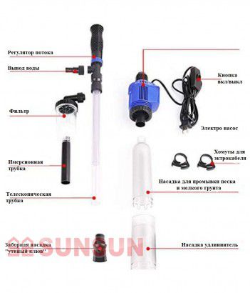 Электрический очиститель грунта SUNSUN HXS для чистки грунта в аквариумах, оснащен электрической помпой для быстрой прокачки воды в аквариуме.
