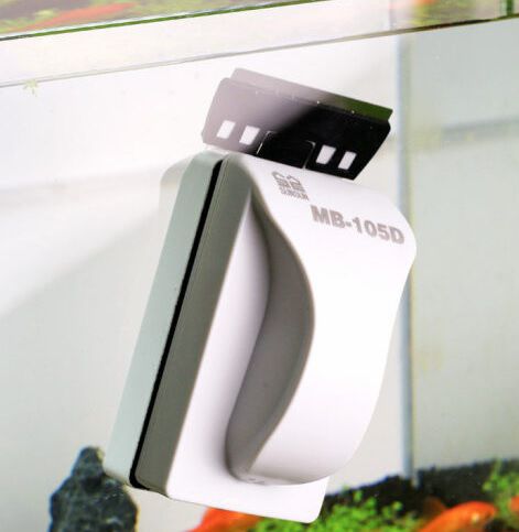 Устройство магнитного скребка состоит из двух магнитов, на один наклеен специальный мягкий материал, а на второй — жесткий ворсистый материал. Принцип действия магнитных скребков в том, что часть с мягким материалом прикрепляют к внешней стенке аквариума, а с жестким ворсом — внутрь аквариума. И при движении внешнего магнита, внутренний будет аккуратно счищать налет со стенок аквариума.