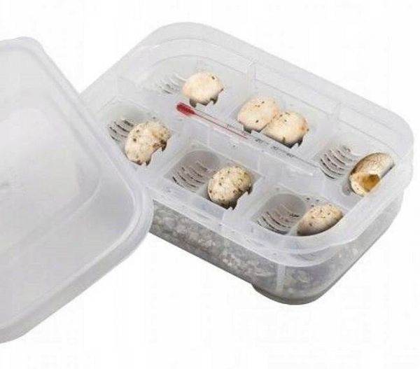 Вмещает до 12 яиц. Имеется встроенный термометр для проверки температуры внутри контейнера. Позволяет проводить инкубацию без субстрата. Обеспечивает постоянную и достаточную влажность.