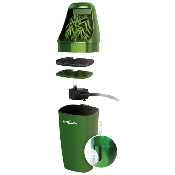 Пластиковая емкость, внутрь которой помещена помпа малой мощности. Вода, циркулируя внутри емкости, стекает по листьям искусственного растения, создавая эффект капель дождя. Для поддержания владности в террариуме и создания места водопоя для террариумных животных древесного образа жизни.
