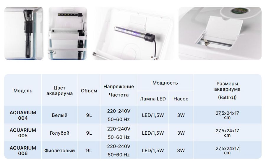 Привлекательный дизайн позволит органично вписать аквариум в любой интерьер, выбрав из трех доступных цветов (белый, голубой, фиолетовый) тот, который понравится вам больше всего.