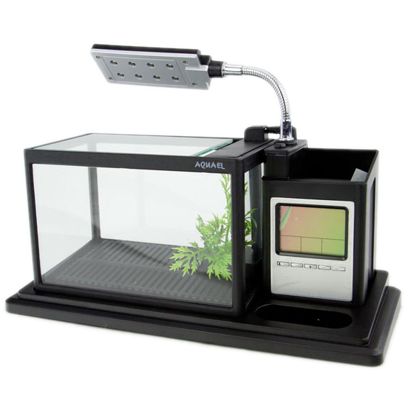 Рядом с аквариумом предусмотрено место для расположения канцелярских принадлежностей, а также есть встроенные часы с будильником и встроенный термометр.