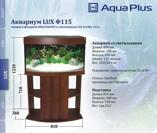 Аквариум LUX Ф115 фигурный, с крышкой и светильником Т8 2×18 Вт, итальянский орех, 115 л