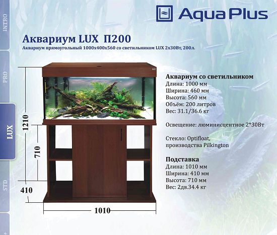 Аквариум LUX П200 прямой, с крышкой и светильником Т8 2×30 Вт, бук, 200 л