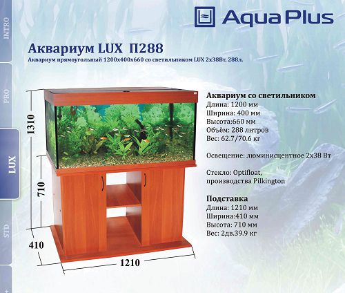 Аквариумы Aqua Plus серии LUX разработаны на основании всего самого лучшего, что было создано в аквариумистике. Это крепкие и надежные аквариумы, которые долго будут служить Вашей семье. Каждый аквариумист, в первую очередь, по достоинству оценит удобный и современный светильник. А широкая цветовая палитра, кратные мебельным размеры и качественные материалы послужат тому, чтобы аквариум органично вписался в интерьер Вашего дома.
