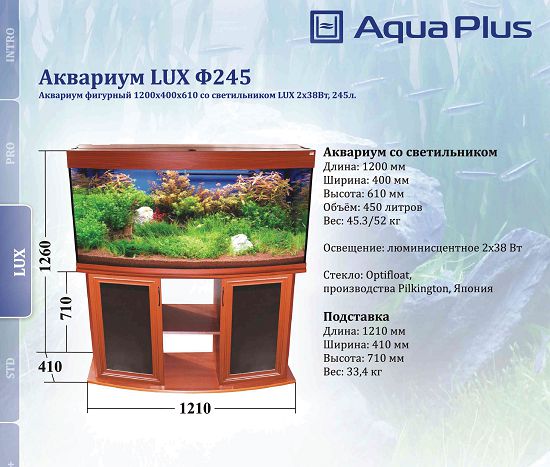 Аквариум LUX Ф245 фигурный, с крышкой и светильником Т8 2×38 Вт, орех, 245 л
