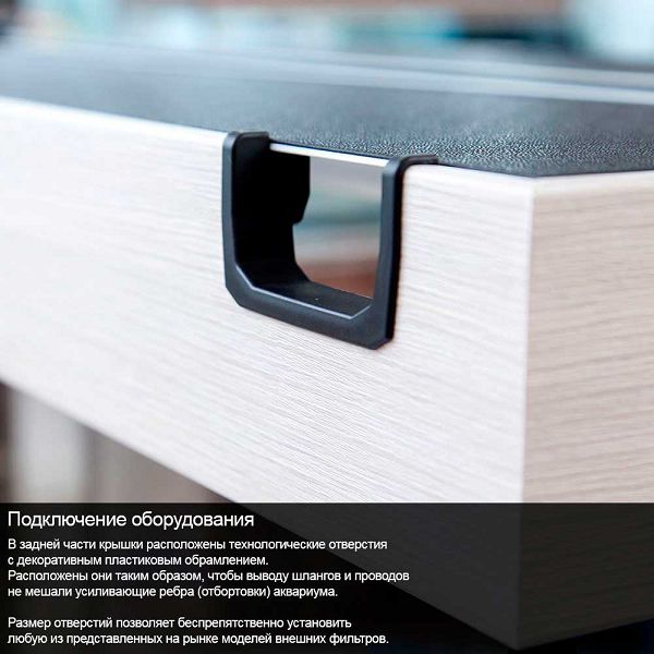 • Нижняя декоративная рамка аквариума обеспечивает правильное распределение нагрузки на подставке, что позволяет не использовать подложку при установке аквариума на подставку;