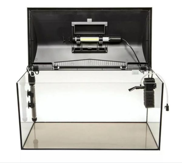 В комплект входят: аквариум с прямой передней стенкой, современная пластиковая крышка, изготовленная по технологии литья под давлением, со встроенным модулем освещения, а также автоматический нагреватель и внутренний фильтр. Особо следует отметить то, что крышка оборудована запатентованной системой открытия SMART OPEN. Эта система устраняет необходимость в петлях и подпорках, обеспечивая удобный доступ к внутренней части аквариумной ёмкости для проведения работ по техническому обслуживанию. Кроме того, в крышке имеется большая откидная дверца для удобного кормления рыб. Встроенный в крышку модуль освещения LEDDY TUBE SUNNY излучает яркий свет, приближенный по спектру к солнечному и не искажающий естественной окраски растений и рыб. Долговечность модуля составляет около 50 тысяч часов работы