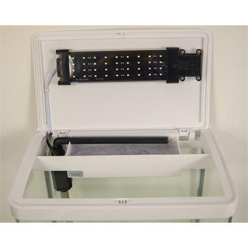 Акваруим имеет П-образное переднее стекло, благодаря чему спереди отсутствуют швы и аквариум визуально становятся больше. Прочная крышка защитит ваш аквариум от попадания посторонних предметов. Крышка имеет защиту от детей. В крышку встроен светодиодный светильник, который имеет режим дневного и ночного освещения.