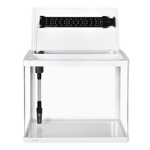 Акваруим имеет П-образное переднее стекло, благодаря чему спереди отсутствуют швы и аквариум визуально становятся больше. Прочная крышка защитит ваш аквариум от попадания посторонних предметов. Крышка имеет защиту от детей. В крышку встроен светодиодный светильник, который имеет режим дневного и ночного освещения.