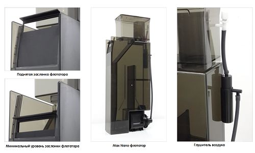 Центральное место в системе фильтрации занимает флотатор. Флотатор, созданный компанией Red Sea® рассчитан для содержания SPS кораллов (мелкополипных мадрепоровых кораллов), флотатор обрабатывает весь объем аквариумной воды примерно 3 раза за час и имеет соотношение воды к воздуху, как 3 к 1. В отличие от других подобных конструкций, флотатор Max® Nano не зависит от колебаний уровня воды в фильтрационном отсеке из-за испарений, имеет регулятор уровня пены для поддержания оптимальной консистенции собираемого скимата, густота скимата будет варьироваться в зависимости от фактического состояния воды и уровня пены в флотаторе. Флотатор Max® Nano работает очень тихо за счет встроенного глушителя на впуске воздуха и губка на выходе, для устранения звука струящейся воды.