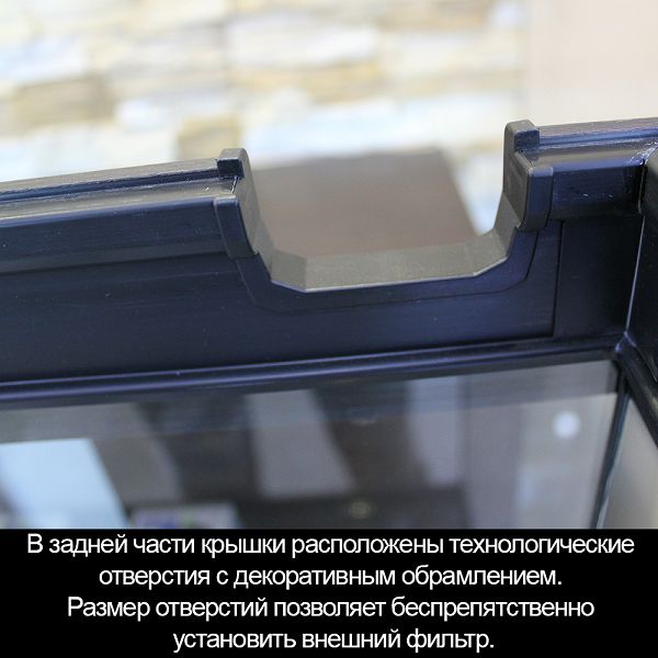 • В задней части крышки расположены технологические отверстия с декоративным пластиковым обрамлением. Размер отверстий позволяет беспрепятственно установить любую из представленных на рынке моделей внешних фильтров;
