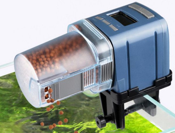 Автоматическая кормушка с электронным дисплеем, на котором отображается текущее время и режим работы. Для настройки режима кормления под ЖК дисплеем расположены 3 кнопки, а также кнопка сверху — для «принудительной» подачи корма.