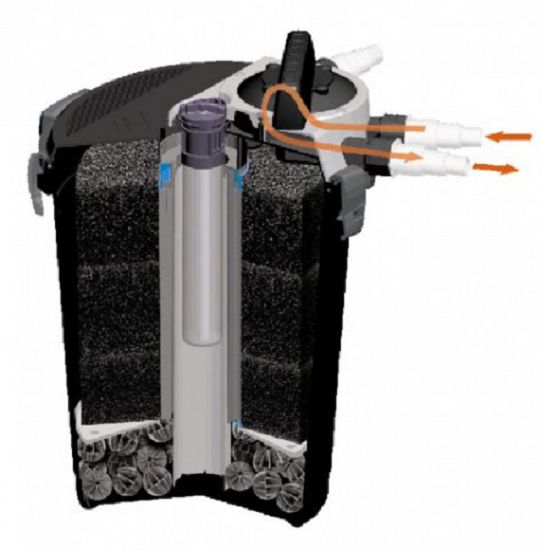 Это единственная в своем роде установка, представляющая собой соединение функций прудового фильтра с функциями высокопроизводительного UV стерилизатора. Сначала вода проходит через фильтрующие губки, затем через слой биошаров.