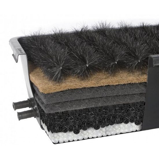 Универсальное оборудование, которое можно устанавливать, как на берегу, так и на дне пруда. Фильтр представляет собой пластиковый короб, наполненный фильтрационными вкладышами (щётки, два слоя губки, кокосовое волокно, биошарики).