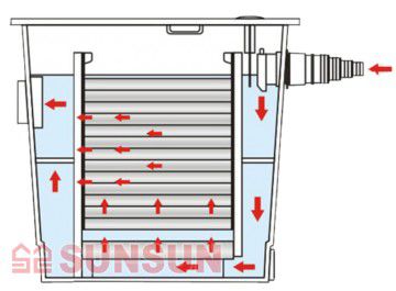 SunSun CBF 350 — прудовый биофильтр, обеспечивающий быструю и надежную очистку воды. Фильтр укомплектован наполнителями для механической и биологической фильтрации. Грязь и взвесь оседают на фильтрующих мочалках при прохождении через фильтр. Кроме того, в порах фильтрующих мочалок живут полезные микроорганизмы, осуществляющие биофильтрацию, их заселение лучше предусмотреть перед запуском рыбы или посадкой основных водных растений. Так как микрофлора пруда особенная, лучше если ваш биофильтр будет заселен нужными бактериями, находящимися в специальных препаратах. Это гарантирует правильную и эффективную биофильтрацию. Обычно заселение бактериями субстрата занимает от 4 до 6 недель. Немного ранее мы советуем высаживать основные водные растения, особенно быстрорастущие.