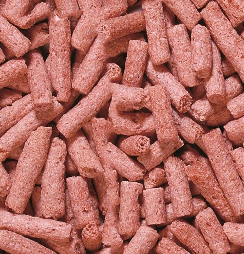 Корм для яркой окраски состоит из гранул, произведенных путем бережной обработки сырья; предназначен для прудовых рыб.