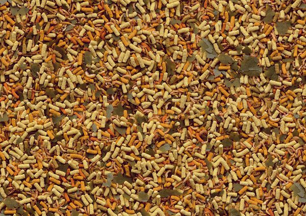 Специально разработанная для золотых рыбок кормовая смесь, в состав которой, помимо хлопьев, палочек, входят высушенные на солнце мелкие пресноводные рачки гаммаруса.