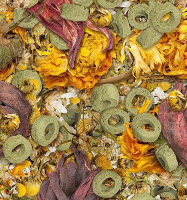 Деликатесный корм, состоящий из смеси высушенных цветов (50%) и колечек, произведенных путем бережной обработки сырья.