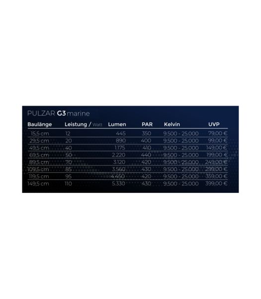 Водонепроницаемый (IP68), доступный в различных вариантах длины и обладающий самой высокой светоотдачей в своем классе, PULZAR G3 устанавливает новые стандарты. Особенно в аквариумах, где для обеспечения достаточного освещения часто приходится устанавливать несколько световых балок, обычно бывает достаточно одного модуля PULZAR G3. Световые модули, в том числе для работы в крышках аквариума, предлагают гибкие и расширяемые возможности.