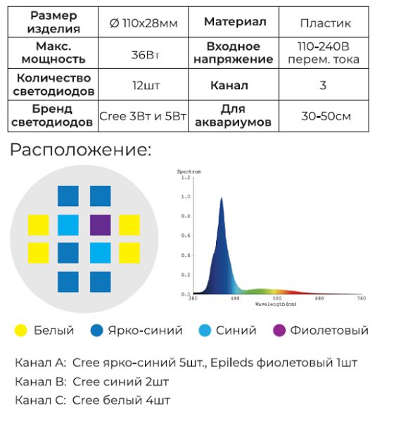 Максимальная мощность 36Вт. Тип светодиодов — матрица (мощность светодиодов от 3 до 5Вт), количество светодиодов 12 шт.
