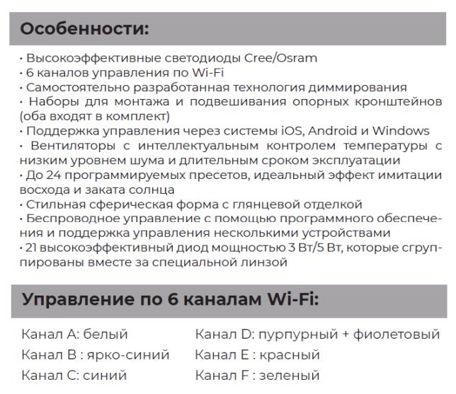 Управление светильником осуществляется при помощи приложения Spectra для устройств на Android и iOS через WiFi. Имеет 6 каналов, канал A — 3 белых светодиода (Osram), канал В — 7 светодиодов Rоyal Blue (Cree), канал С — 7 синих светодиодов (Cree), канал D — 2 фиолетовых светодиода (Epiled), канал Е — один красный светодиод (Cree), канал F — один зеленый светодиод (Cree).
