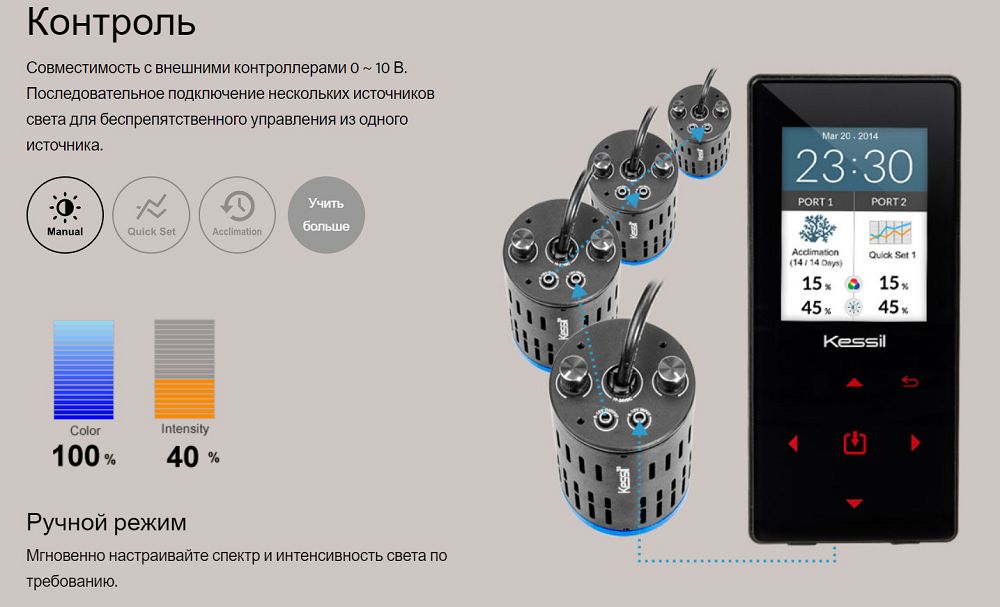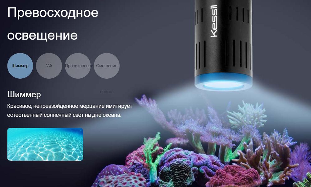 Запатентованная смесь ультрафиолетового света усиливает рост и цвет кораллов, создавая красивое непревзойденное мерцание, которое повторяет естественный вид солнечного света на дне океана. Уникальная технология Dense Matrix Led концентрирует несколько светодиодных чипов в единую матрицу, создавая мощный и проникающий источник света с широким охватом. Средняя глубина проникновения света составляет от 60 до 70 см для большинства рифов. Проникновение может быть дополнительно усилено путем размещения нескольких блоков в непосредственной близости друг от друга.