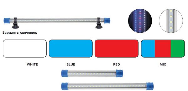 Герметичный корпус позволяет устанавливать светильник на глубину до 70 сантиметров. С помощью двух присосок светильник крепится к стеклу или ко дну аквариума.