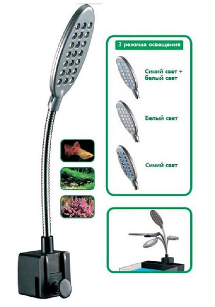 Регулируемый держатель позволяет закреплять светильник на аквариумах с различной толщиной стекла. Благодаря гибкой штанге, свет можно направить в любую часть аквариума. Стильный и компактный светильник обладает высокой энергоэффективностью, легко крепится на край аквариума.