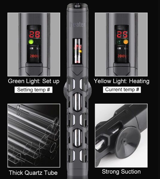 Устройство имеет большой и легко читаемый ЖК-дисплей, который постоянно отображает текущую температуру воды в аквариуме. Во время программирования устройства на экране отображается температура, установленная пользователем. Светодиод рядом с дисплеем указывает на работу нагревателя.