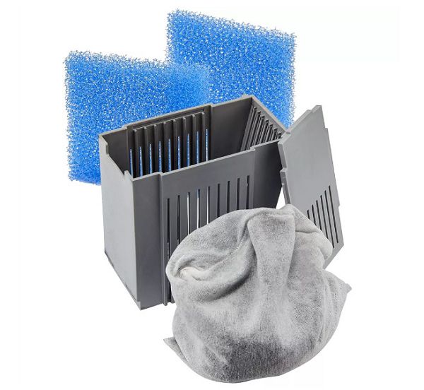 Включает в себя один картридж, заполненный угольным фильтрующим материалом, и две механические фильтрующие губки размером 20 ppi.