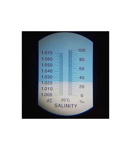 Ручной оптический рефрактометр для аквариума предназначен для определения содержания соли (солености) в воде. Рефрактометр является точным оптическим прибором для измерения концентрации соли в морских аквариумах. Принцип работы основан на явлении рефракции — показателя преломления или разности показателей преломления света жидких сред, степень которого зависит от содержания соли в растворе. Одна шкала проверяет уровни NaCl в диапазоне 0−100 ppt (с делением шкалы 1 ppt), а другая шкала измеряет удельный вес в диапазоне от 1.000 до 1.070 (точность ± 0,001). И то, и другое позволяет напрямую определять соленость в воде, которая содержит растворенную соль и мало или совсем не содержит других растворенных твердых веществ.
