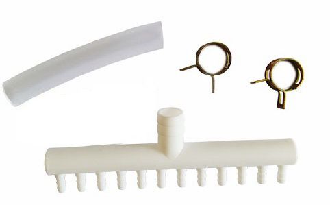С помощью распределительной гребенки можно одновременно подать воздух на 12 аквариумов или создать аэрацию по всему периметру пруда. Данный распределитель на выходе имеет диаметр 6 мм, что позволяет подсоединить к нему стандартный компрессорный шланг с диаметром 4/6 мм.