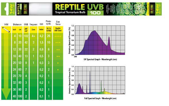 Улучшает окраску животных. Repti glo 5.0- 5% УФ Средняя интенсивность: применяются для содержания тропических и субтропических рептилий — животных, живущих на опушках, в верхней части кроны и в саваннах. Например: большая часть ящериц, змей