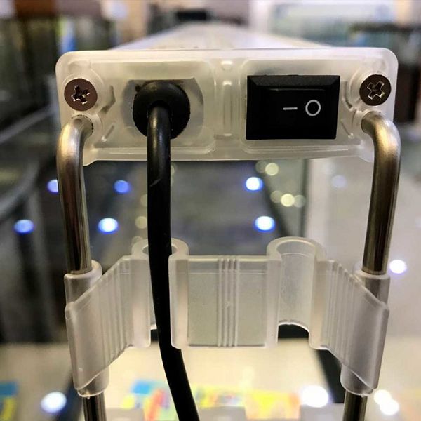 • Металлические раздвижные ножки с надёжным креплением на стекло, с их помощью светильник можно устанавливать на аквариум разной длины и регулировать его высоту от 0 до 12 см.