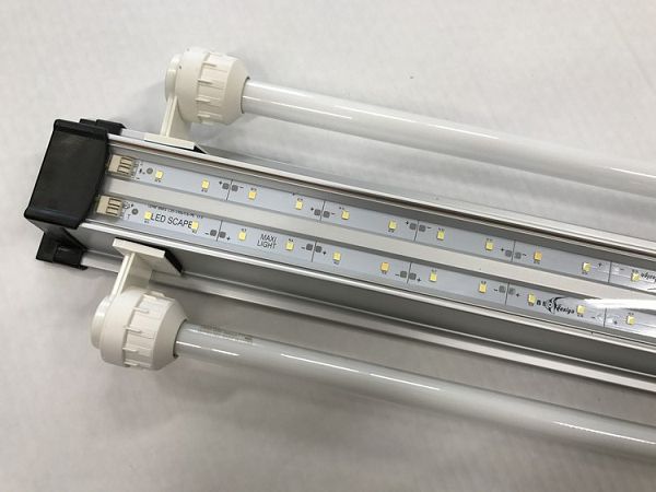 LED SCAPE HYBRID MAXI LIGHT 6125K — универсальная и полноспектральная, диммируемая модель светильника с совмещением люминесцентной (Т5 или Т8) и LED технологий в одном светильнике (технология HYBRID LIGHT). Предназначена для потребителей требующих максимальный световой поток при установке на штатное посадочное место в крышке аквариума. Светодиодная часть светильника построена на базе модели LED SCAPE MAXI LIGHT 6125K и их характеристики полностью идентичны. Благодаря добавлению в светильнике традиционных люминесцентных ламп колористическая характеристика может быть легко изменена потребителем простой заменой ламп. Данная модель (в стандартной комплектации) развивает экстремальный световой поток 11 500 lm на 1 метр длины и является самой яркой серийной моделью. Светодиодная часть светильника построена по технологии Mix White, т. е. в каждой линейке присутствуют два типа сверх ярких диодов -15% диодов тёплого белого света 4000К и 85% диодов холодного белого света 6500К, что существенно влияет на выделение окрасок гидробионтов в красной и синей частях спектра, в отличие от светильников с одним типом диодов. Светильник прекрасно подойдёт как для специализированных аквариумов — травников, так и для качественного красочного освещения любых животных. Светильник обладает отличной цветопередачей CRI >85 (для диодов). В качестве источников света в светильнике применены сверх ярких диоды типа SMD 2835 от компании Seoul Semiconductor Co., Ltd. (Южная Корея) и спектральные аквариумные люминесцентные лампы Т5 или Т8 (только для светильников менее 65см). Энергоэффективность светильников 94.03 lm на Вт*. Безлинзовая технология (угол раскрытия луча: 120 °). С высоким КПД и длительным сроком службы (более 60 000 часов для диодов).