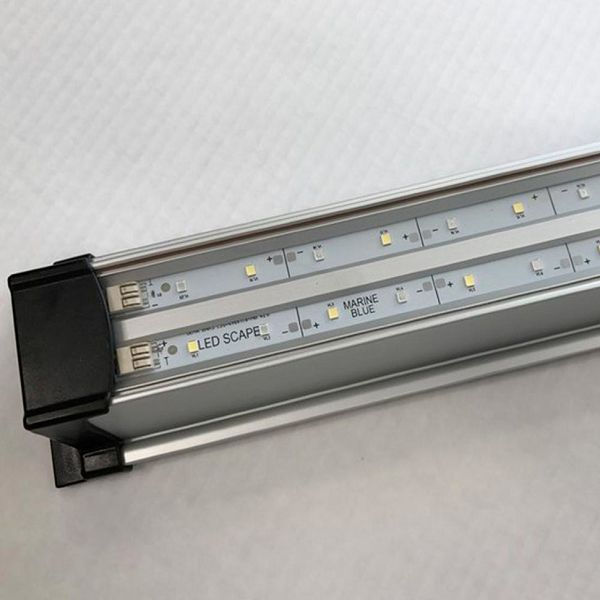 LED SCAPE MARINE BLUE 12000K — специализированная, диммируемая модель светильников для освещения морских аквариумов и их имитаций с пресной водой, отлично передаёт естественную окраску содержащихся животных и кораллов. Идеальное решение для освещения морских биотопных аквариумов и хардскейпа. В составе светодиодных плат (линеек) применены 3 типа диодов с разными спектральными характеристиками — два типа синих диодов с диапазоном длины волны 440−460 нм (15%) и 465−475 нм (35%) и холодный белый 6500К (50%). Такая комбинация разных диодов позволяет добиться великолепной насыщенности окраски рыб и подводного ландшафта. Цветопередача светильника CRI >85, световой поток 3540 lm на 1 метр длины. В качестве источников света в светильнике применены белые сверх ярких диоды типа SMD 2835 от компании Seoul Semiconductor Co., Ltd. (Южная Корея) и цветные диоды SMD 2835 от компании Everlight Electronics Co., Ltd. (Тайвань). Энергоэфективность светильника 78,2 Лм/Ватт при токе 350mA. Безлинзовая технология (угол раскрытия луча: 120°) с высоким КПД и длительным сроком службы (более 60 000 часов).
