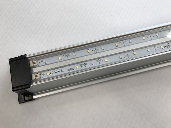LED SCAPE MARINE BLUE 12000K –специализированная, диммируемая модель светильников для освещения морских аквариумов и их имитаций с пресной водой, отлично передаёт естественную окраску содержащихся животных и кораллов. Идеальное решение для освещения морских биотопных аквариумов и хардскейпа. В составе светодиодных плат (линеек) применены 3 типа диодов с разными спектральными характеристиками — два типа синих диодов с диапазоном длины волны 440−460 нм (15%) и 465−475 нм (35%) и холодный белый 6500К (50%). Такая комбинация разных диодов позволяет добиться великолепной насыщенности окраски рыб и подводного ландшафта.