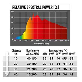 Лампа REPTI PLANET Daylight Basking дает оптимальное соотношение ультрафиолетового UVA излучения, светового излучения и инфракрасного (теплового) излучения, идеальна в комбинации с UVB и ночными лампами (например, Repti Planet Repti UVB, Infrared Heat, Night Heat). Речь идет о лампе широкого спектра, которая поддерживает такие физиологические процессы, как, например, активность, прием пищи и размножение. Благодаря специальному отражающему слою внутри лампы предлагает большую интенсивность светового и теплового излучения.