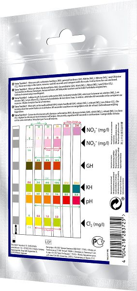 Тест 6 в 1 GH/kH/NO2/NO3/pH/CL2. Набор полосок-тестов для быстрой проверки показателей качества воды. Определение 6 наиболее важных показателей: pH, карбонатной и общей жесткости GH, KH, содержания нитритов, нитратов и хлора. Пригоден для всех пресноводных аквариумов.