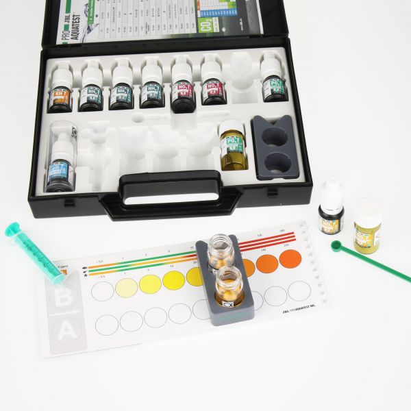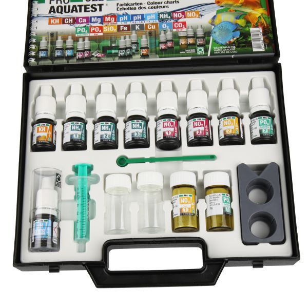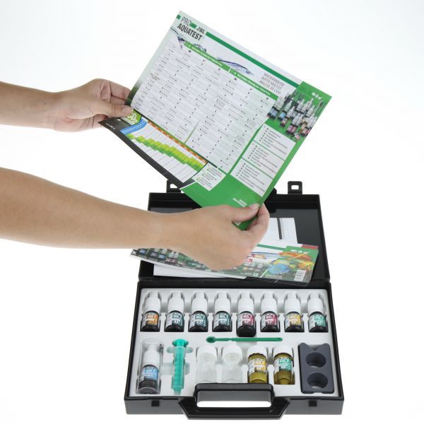 Содержит тесты на карбонатную жёсткость, рН, аммоний/аммиак, нитриты, нитраты и фосфаты.