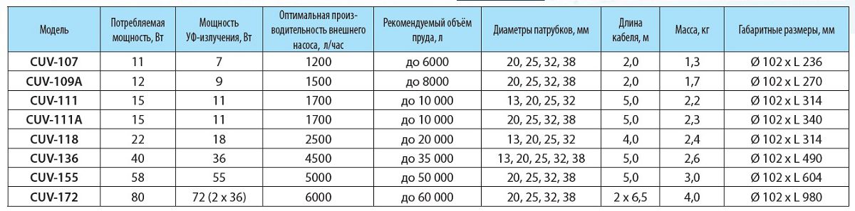 Комплектация: Кварцевая колба, водонепроницаемое уплотнительное кольцо, УФ — лампа, крышка с резьбой и предохранителем, шнур и трансформатор, пластиковый корпус, два крепления для корпуса, два штуцера для подключения шлангов (на вход и выход).