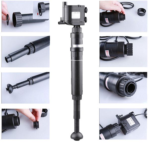 Конструкция стерилизатора позволяет использовать его как внутри аквариума, так и как внешнее устройство. Преимуществом этих стерилизаторов является возможность установки их в качестве проточного стерилизатора в комплексе с насосом-помпой. Для этого в комплекте к стерилизатору прилагаются специальный переходник для подключения к «голове» насоса и отсекающая, защитная сетка, которая устанавливается снизу стерилизатора — на заборное отверстие. Это необходимо для того, чтобы избежать попадания внутрь стерилизатора и насоса крупных частиц мусора, аквариумных растений или аквариумных обитателей.