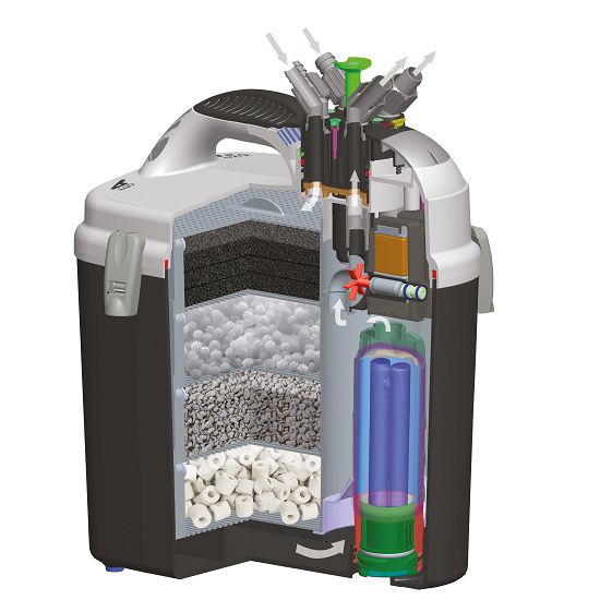 Соответствующим образом подобранные механические, химические и биологические наполнители, размещённые в корзинах фильтра, обеспечивают полноценную и эффективную фильтрацию в аквариумах до 700 л.
