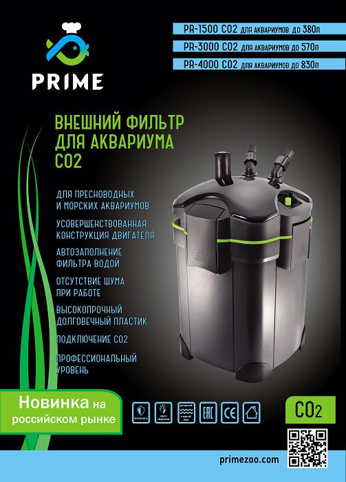 Внешние фильтры PRIME для СО2 — это уникальные, не имеющие аналогов на российском рынке фильтры. Фильтры предназначены, в первую очередь, для использования в пресноводных аквариумах с живыми растениями. Углекислый газ подается через счетчик пузырьков непосредственно в камеру ротора фильтра, при этом производительность фильтра не снижается. Так как растворимость углекислоты в воде в 70 раз выше растворимости кислорода, то в результате энергичного смешивания ротором фильтра газа с водой, на выходе получается вода, обогащенная СО2, практически без пузырьков. А с помощью выходных патрубков типа «флейта» эта вода равномерно распределяется по всему аквариуму. Таким образом, отпадает необходимость во внутренних диффузорах для СО2, но при этом улучшается газообмен и эффективное растворение углекислоты в воде.