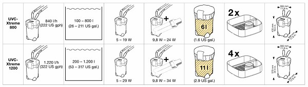Благодаря встроенной лампе UV-C с амальгамой их срок службы составляет до 42%, а их производительность более чем на 52% по сравнению со стандартным УФ-С. До 93% патогенов и водорослей в аквариуме удаляются. Электронно-диммируемые характеристики могут быть скорректированы с учетом требований и, следовательно, особенно энергосберегающие, высокая производительность насоса уже достигнута при 5 Вт.