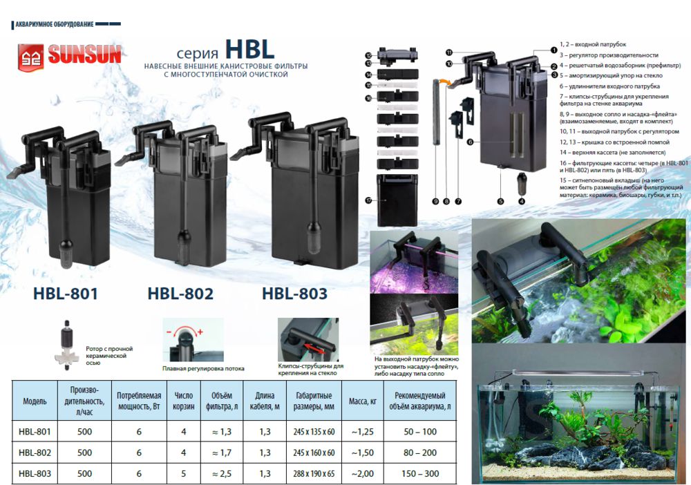 Фильтр внешний канистровый навесной SUNSUN HBL-801 с регулятором потока, 6 Вт, 500 л/ч