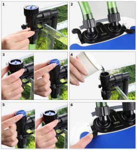 • Удобные краны плавной регулировки потока на заборной и выпускной линиях снабжены пробками для стартового заполнения фильтра водой и струбцинами для крепления на стекле любой толщины