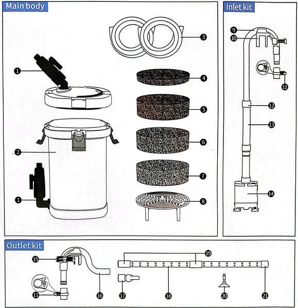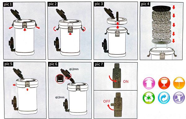 Внешний канистровый фильтр для малых аквариумов 25−100 л. Может быть размещен как рядом с аквариумом, на одном уровне, так и в тумбе под аквариумом. Фильтр обеспечивает оптимальную механическую и биологическую фильтрацию. Внешний фильтр полностью укомплектован необходимым набором фильтрующих элементов. Нежелательные частицы, грязь задерживаются, проходя через входящие в комплект фильтра, мочалки. Механическая фильтрация осуществляется при прохождении через мочалки с порами разного размера: крупными (синяя), средними (желтая) и мелкими (черная) + вата.
