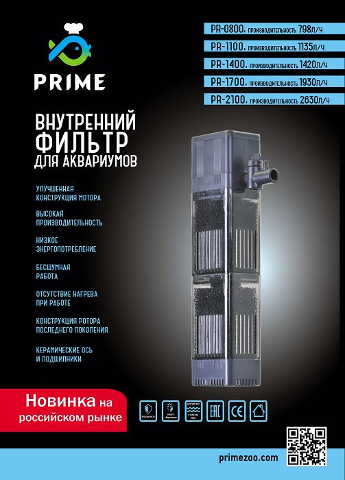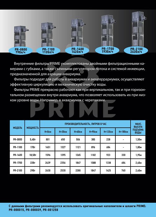 Внутренние фильтры PRIME являются представителями фильтров, которые занимают недорогой сегмент нашего отечественного рынка. Но несмотря на низкий ценовой диапазон, они являются надежнейшим оборудованием и, наверняка, быстро завоюют любовь и уважение российских аквариумистов. Внутренние фильтры PRIME способны работать продолжительное время в сильнозагрязненной воде, например, в акватеррариумах с черепахами или крокодилами без частого обслуживания, не теряя при этом своей мощности и работоспособности.